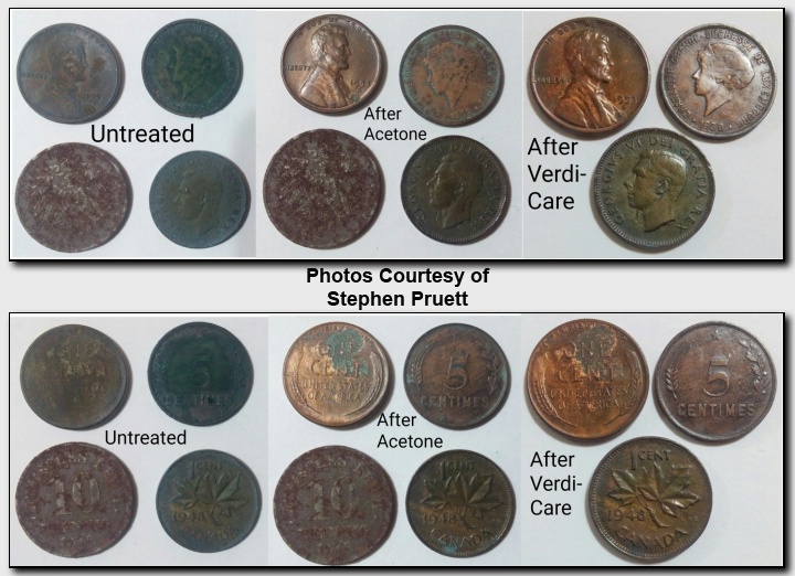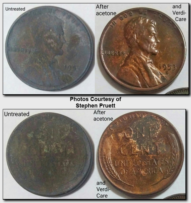 Below are some before and after pictures of coins cleaned useing Acetone and VERDI-CARE™.