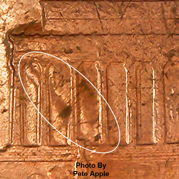 A good example of this can be found on the reverse side of the 1973-D Lincoln cent. For an unknown reason, several reverse dies from the 1973-D cent show a raised area in a similar location. The raised area can change in size and shape from die to die, but is always found in the same location. It is found on the left side, and in the second and third bays of the Memorial building.