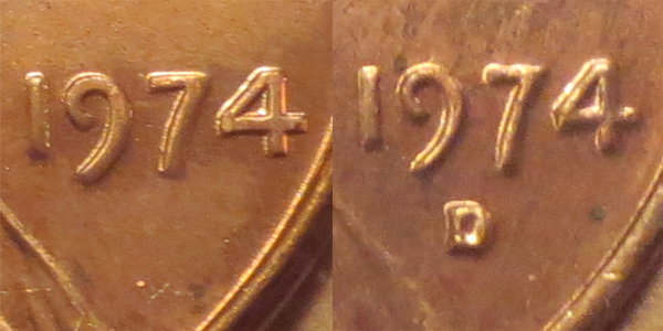 1974 was also a year which also saw a large and small date variety. The mint had made a new master die for the 1974 cents which is doesn't do often, usually only when there is to be a change in the cent or the composition of it. The mint had been looking for a replacement for the Copper cent and even minted a few Aluminum cents in 1974. This may be the reason for the new master die. Later in the year, the mint again decided to make a new master die with a smaller date and less detail than the previous die. The large date is sometimes referred to as a type I and the smaller date as Type II. The differences between the two varieties is not great, nor is either one hard to find in circulation. This may be why they aren't as popular with collectors as some of the other large and small date varieties. Since this difference in size was on the master die itself, the large and small dates were made at all three mints, Philadelphia, Denver, and San Francisco.