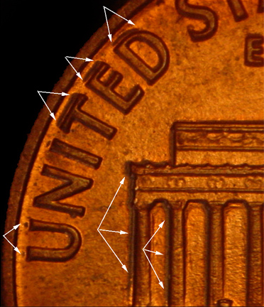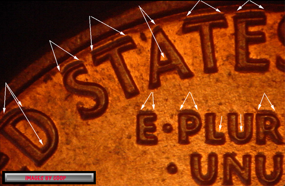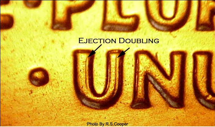 Split plate doubling usually occurs on the side of the devices facing the rim. It is most commonly found on the mint mark but it can affect any of the raised areas of the coins design.